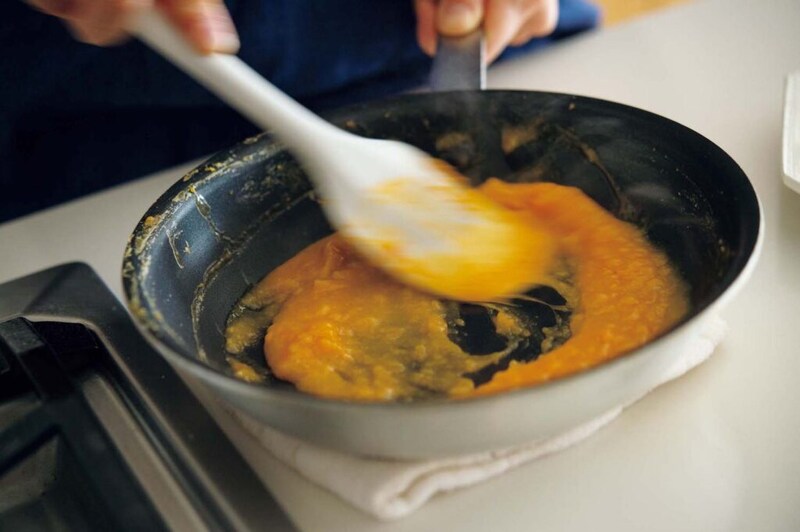 2.ボウルに卵を割りほぐし、塩を加えてさらによく溶く。フライパンにバターを弱火で溶かし、卵を流し入れる。ゴムベラでゆっくり全体を混ぜながら、30~35分かけて煮詰めていくように火を入れる。途中、濡れ布巾にフライパンの底をあてながら、一気に火が入らないようにする。卵にとろみがつき、まとまってきたら火を止める。