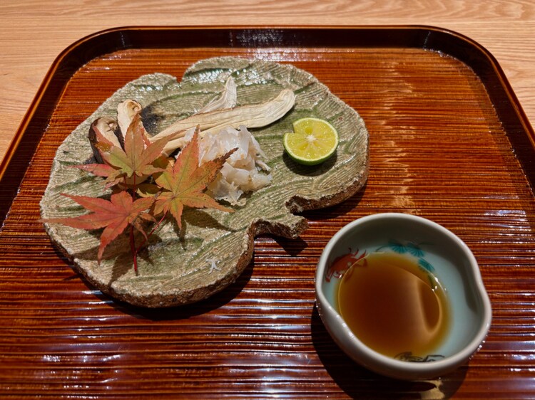 「毛蟹、松茸の炭火焼き」蟹は熱が加えられると甘みが増すそうで、まずは刺身で生の毛蟹を味わい、そのあとに焼いた毛蟹をいただくことで、調理法で蟹の味わい、食感、風味が異なることを実感できます。松茸も肉厚で旨みたっぷり。とても贅沢です