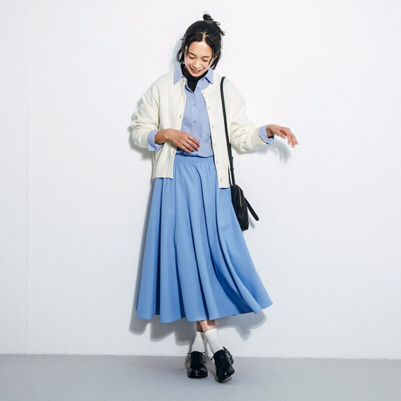 スウェットライクニットドルマンカーディガン¥2,490、ソフトシアーハイネックT(一部店舗のみ販売)¥990、サーキュラーミディスカート¥2,990/すべてジーユー、靴下¥1,100/タビオ、レースアップシューズ¥50,600/プリュス バイ ショセ、バッグ¥35,200/パドカレ(パドカレ六本木)、イヤカフ(3個セット)¥8,800/アビステ