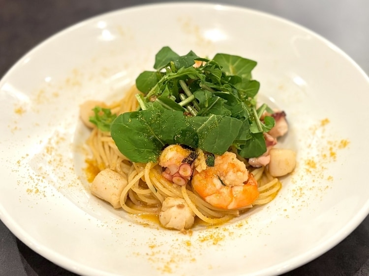 『海の幸のマッキアートソース スパゲッティーニ からすみ和え』 。シェフ自慢の自家製ソースが絡む一皿。アルデンテに茹で上げられた麺と、季節の素材が織りなすマリアージュを堪能できます
