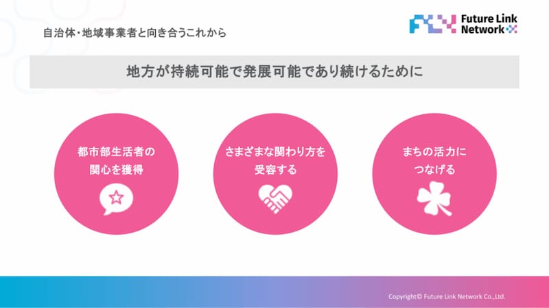 ここで重要なのは、これらは必ずしも1段ずつ登る階段ではないということです。ある人は複数見つけること自体を楽しんだり、ある時は段階的に進んで繋がったり、行き来したり。このそれぞれに合った関わり方を許容する「仕掛け」こそが、FLNがデザインする関係人口創出です。