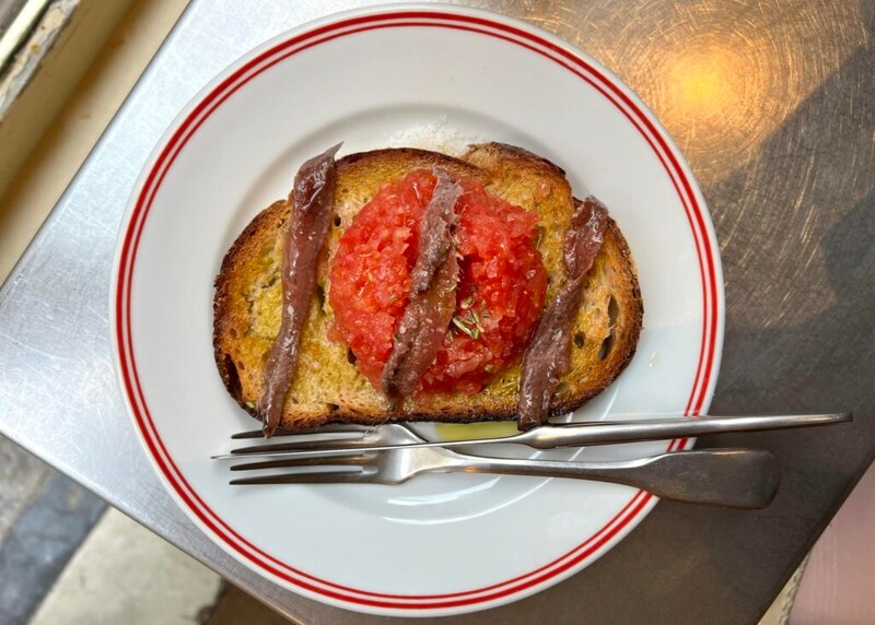 イラストで描かれた通りではあったけれど、実物のほうがずっとスッキリ、垢抜けた印象だった。パンは香ばしく焼かれ、軽やかで、噛むごとに大きく音を立てた。トマトは、ところどころ細かい角切りが残り、オリーヴオイルは香り高く、トマトの果汁と合わさってパンに少し染み込んでいる。トマト自体には味付けがされていなくて、とてもフレッシュな感じがした。角の取れた塩気のアンチョビを少しずつトマトと絡めると、いい塩梅で、たまに鼻に立ち上るローズマリーの香りが心地よい。どこにもニンニクの香りを感じず、それがとても食べやすかった。