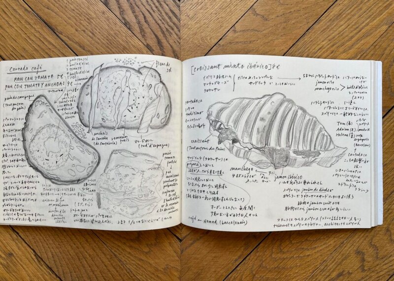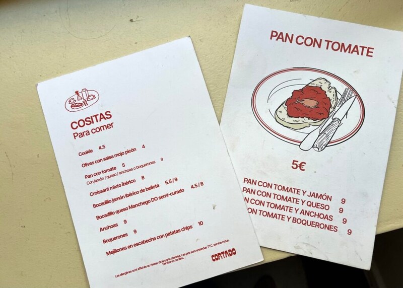 それでもまずはタルティーヌ!と列に並んだ。自分の順番がきて、カウンターに置かれたメニューに視線を落とすと、2種類ある。うち1枚は「パン・コン・トマテ」(スペイン語で「パンとトマト」を意味する、トマトをのせたカタルーニャ料理)の見出しがおどり、真ん中に大きなイラストが描かれ、その下にはスペイン語でさらに4種類のパン・コン・トマテが書かれていた。「そうか、ここはスペインのコーヒーショップなのか!」と理解して、アンチョビのせを頼んだ。