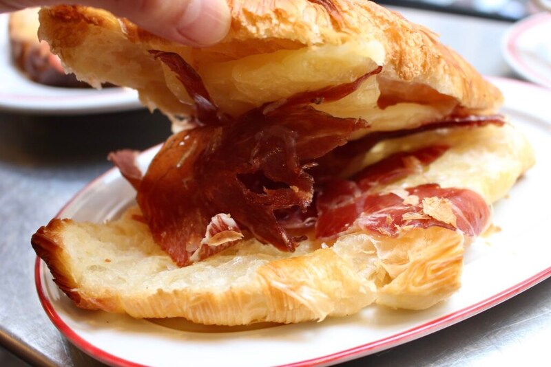 生ハムを挟んだものはスペインではよく見かけるらしいのだけれど、「パリの強みはやっぱりクロワッサンがおいしいこと!」。店から徒歩5分ほどの、クロワッサンに定評のあるブーランジュリー『Tout Autour du Pain(トゥ・トトゥール・デュ・パン)』から仕入れ、サンドイッチはスペインのスタイルでも、スペインでは実現できない味。いっぽうで、パリでは、最近ごくたまにクロワッサンのサンドイッチを見かけるようになったとはいえ、そこまで出合うことはなく、イベリコ豚の生ハムを挟んでいるとなればさらに希少だ。