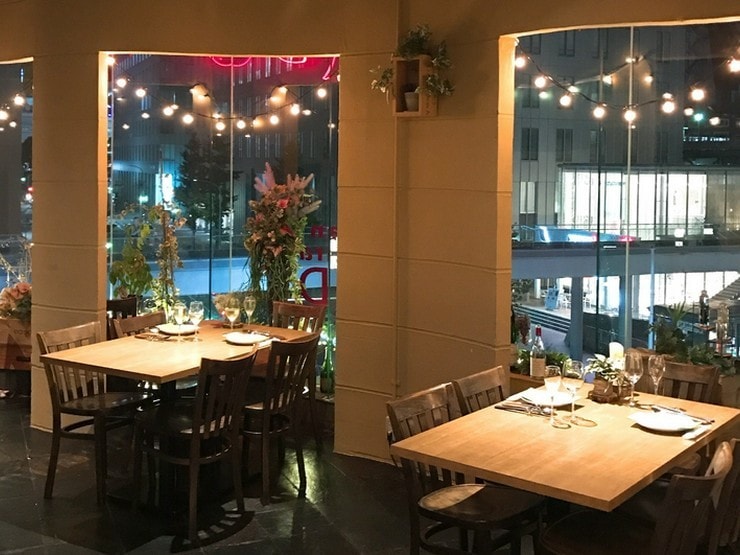 店内は大きな窓と、センス良く配されたグリーンが印象的な洗練された空間。ランチタイムは柔らかな日差しに包まれながら、ディナータイムは美しい夜景を眺めつつ、ゆったりと食事を楽しむことができます。メッセージ付きホールケーキがセットになった「記念日コース」(要予約)もあるので、大切な日の思い出づくりにもピッタリの一軒です。
