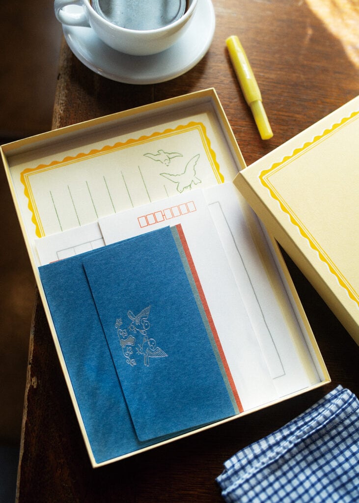 京都の中心・寺町専門店会商店街に店を構える、1663年創業の『京都鳩居堂』へ。目当ては、道を挟んで向かいの別館で体験できる「レターバイキング」。便箋は約60種、封筒は約30種と、和文具専門店ならではの豊富なラインナップを前に、紙質や色み、模様を一枚ずつ確かめながら、自分だけのレターセットを作れる。手に取りやすい価格でお土産にもぴったりで、京都から大切な誰かを思って手紙をしたためるのもいい。便箋(10枚)¥385、封筒(3枚)¥220、ボックス¥385(以上京都鳩居堂 075−231−0510) その他スタイリスト私物