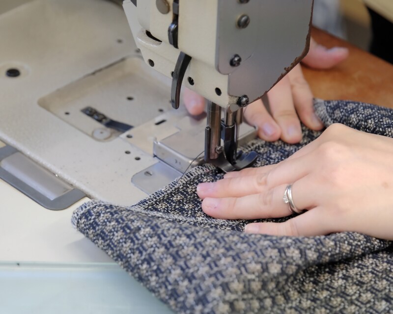 検品前の最終工程である椅子張り・組み立ての作業場では、断裁された布地をミシンで縫製する作業と、大きな肘掛け椅子に布地を張る作業が行われていました。機械で行う布地断裁を除き、すべてはていねいな手作業による仕上げ。完成間近の肘掛け椅子はとても座り心地がよさそうでした。