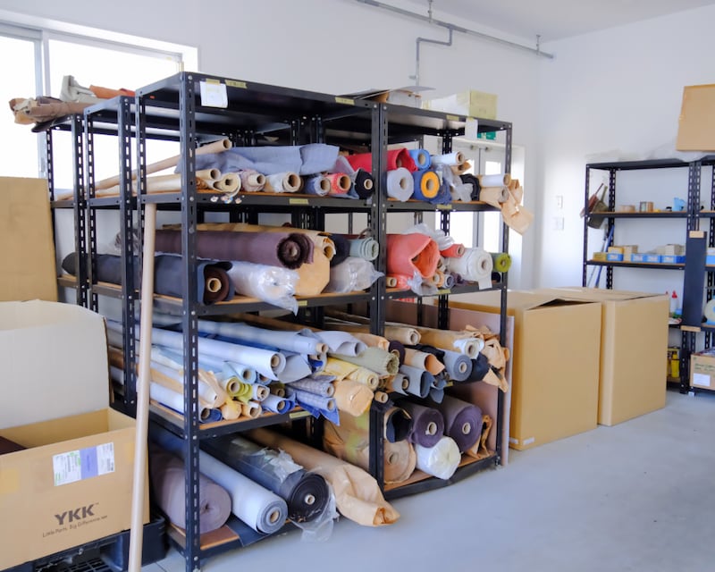 椅子張り・組み立ての作業場入口に積まれたさまざまな布地