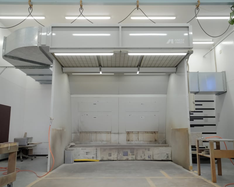 約5,000坪という広大な敷地には大量の資材や製品在庫を管理する倉庫が並び、その一角に事務所棟と各工程の作業場があります。木材選定から木取り、プレス、加工などを行う木工作業場。続いて下塗り、中塗り、仕上げと何回も重ねる塗装の作業場。いずれも大きな作業機械が並んでいます。