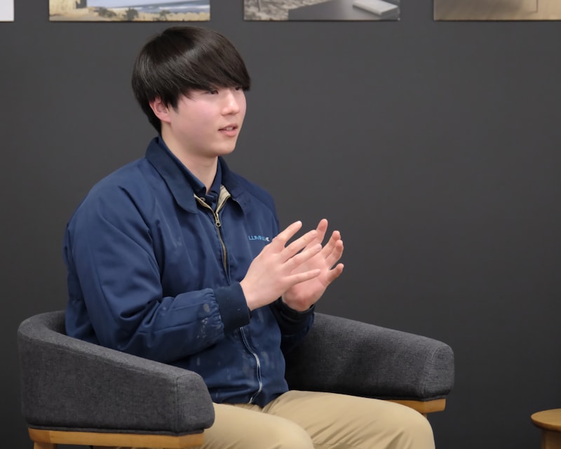 現在、福島工場に勤務する従業員は12名ほど。家具職人というと、長く修業を積んだ年配者というイメージが強いかもしれませんが、ここで働く人は20~30代が多いそうです。その一人、2026年2月現在27歳で最年少という佐藤大樹(さとう たいき)さんに話を聞きました。佐藤さんは2019年に専門学校を卒業後すぐ宏昇製作所に入社し、塗装部に所属しています。