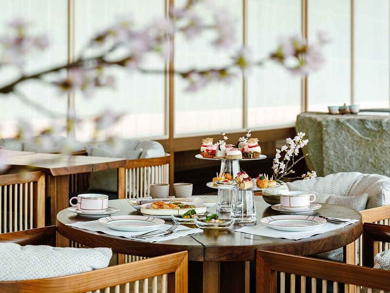 19階に位置するティーラウンジ「にじり」は、茶道の精神を現代的に解釈した、静謐でありながらモダンな空間。 ここで供されるのは、春の訪れを祝う「桜」をテーマにしたアフタヌーンティーだ。