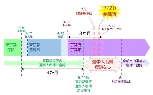 さらに、その前の東京都港区から転出して4か月が経過していたため、2025年5月11日頃、同区の選挙人名簿から抹消されていた。