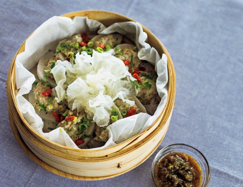 3. 蒸気の上がった鍋にのせて中火で10 分蒸し、粗びきこしょうをかける。そのままでも、万能たれをかけていただいてもおいしい。