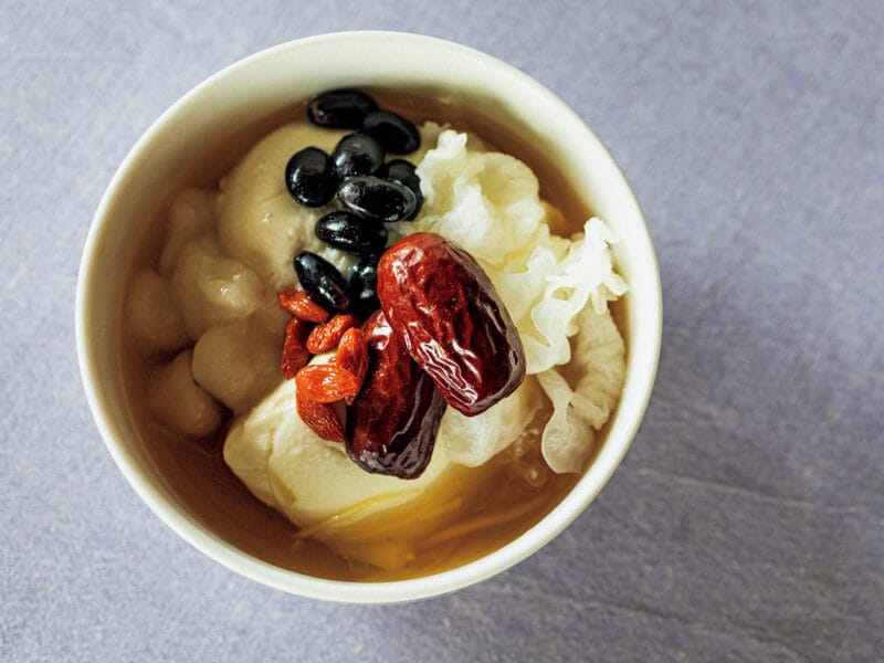 3. 豆腐から出た水を捨て、なつめ、クコ、黒豆、もちをトッピングし、しょうがシロップをかける。