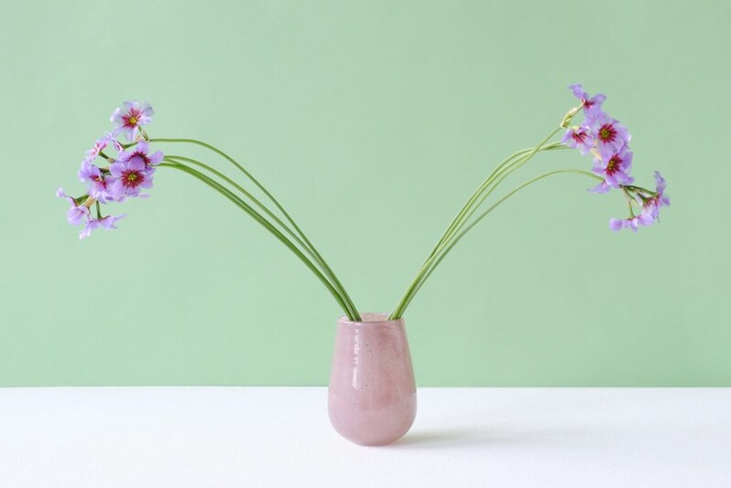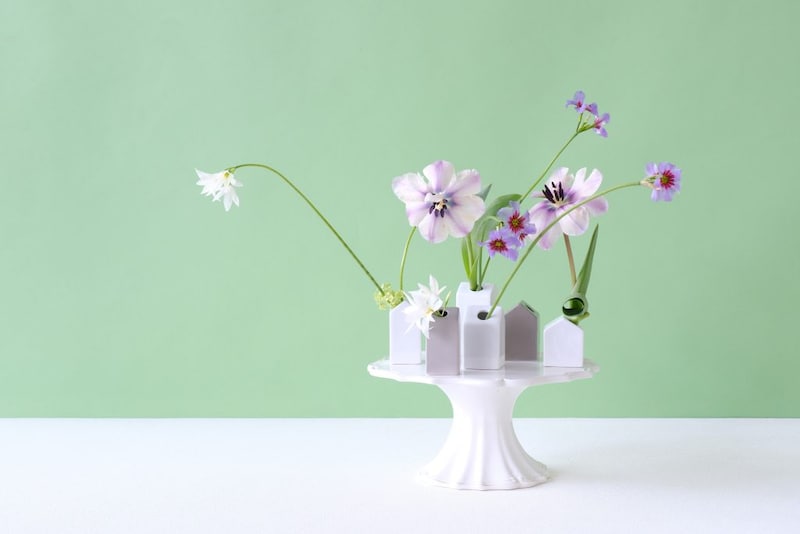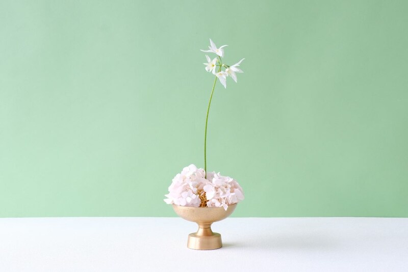 繊細な花をあしらう場合は、花器の色を抑えたシンプルなものを選ぶと、花の印象を損なわず、一体感が生まれます。