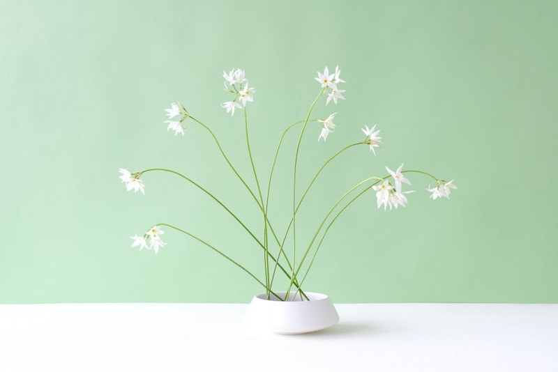 ここでは、白いリューココリーネをさまざまな方向へ向けて生けました。