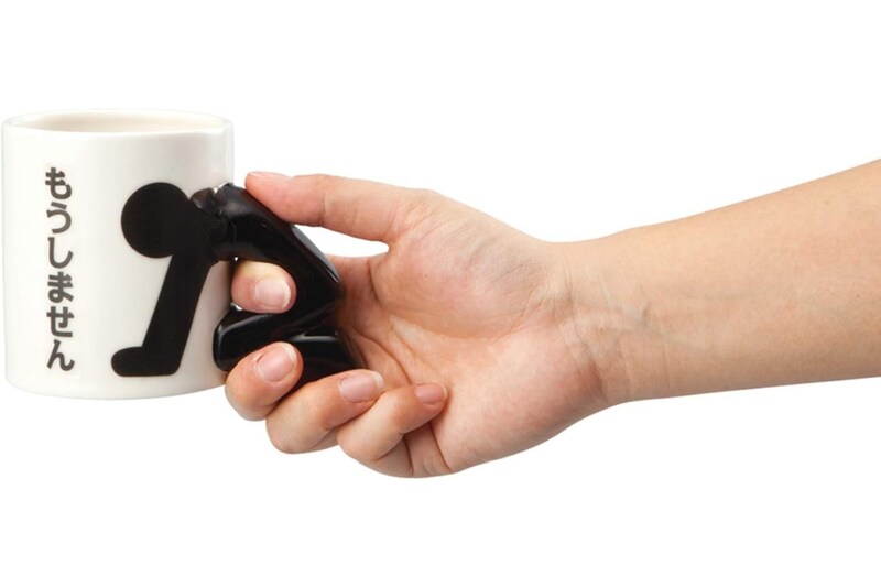 取っ手部分に深々と土下座する人の姿が造形されており、思わずクスッと笑ってしまうデザインです。