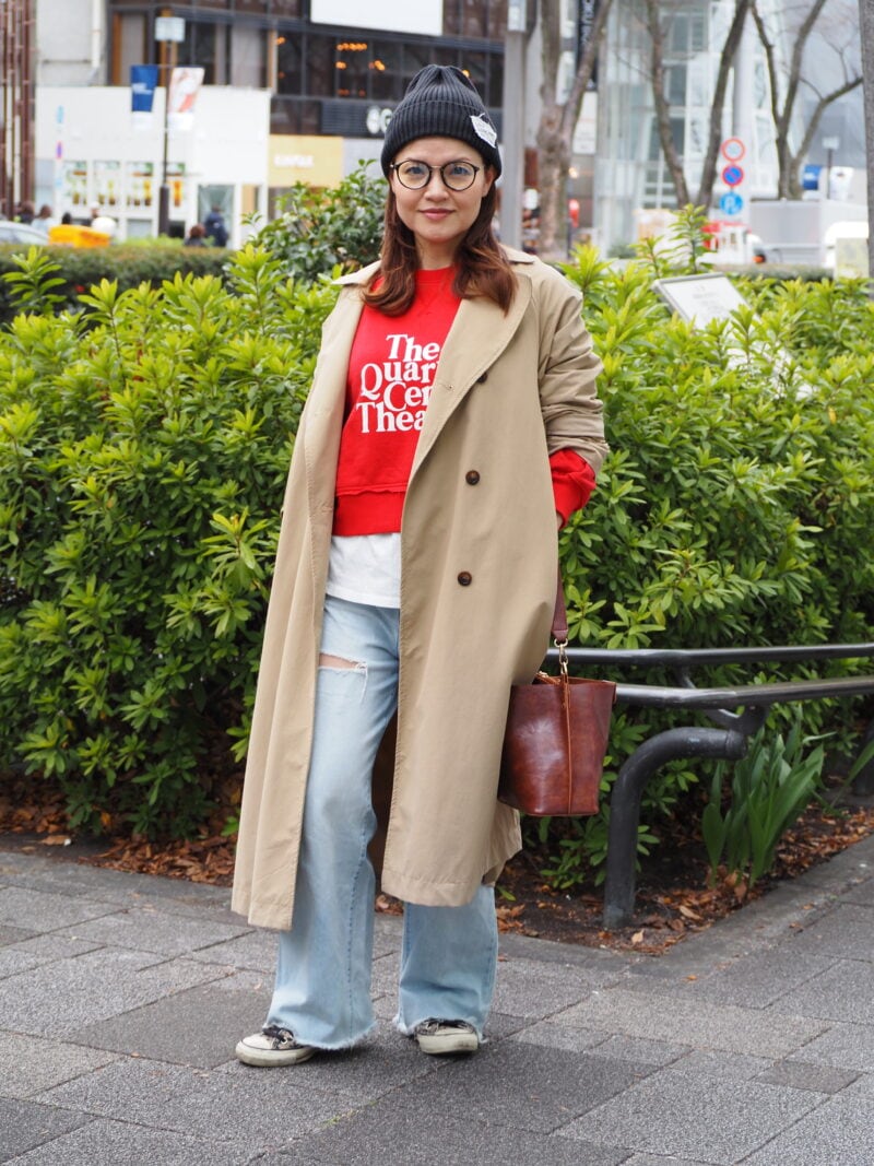 3月の後半戦は、トレンチコートとデニムのスタイリングが気になる! 赤いスウェットをアクセントに春のおしゃれを謳歌。ショート丈のスウェットとTシャツのレイヤードが、さりげない抜け感を演出しています。
