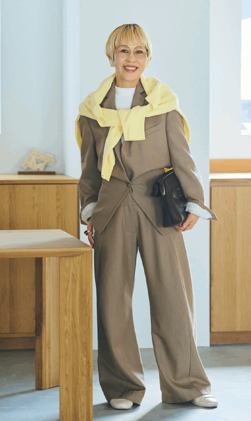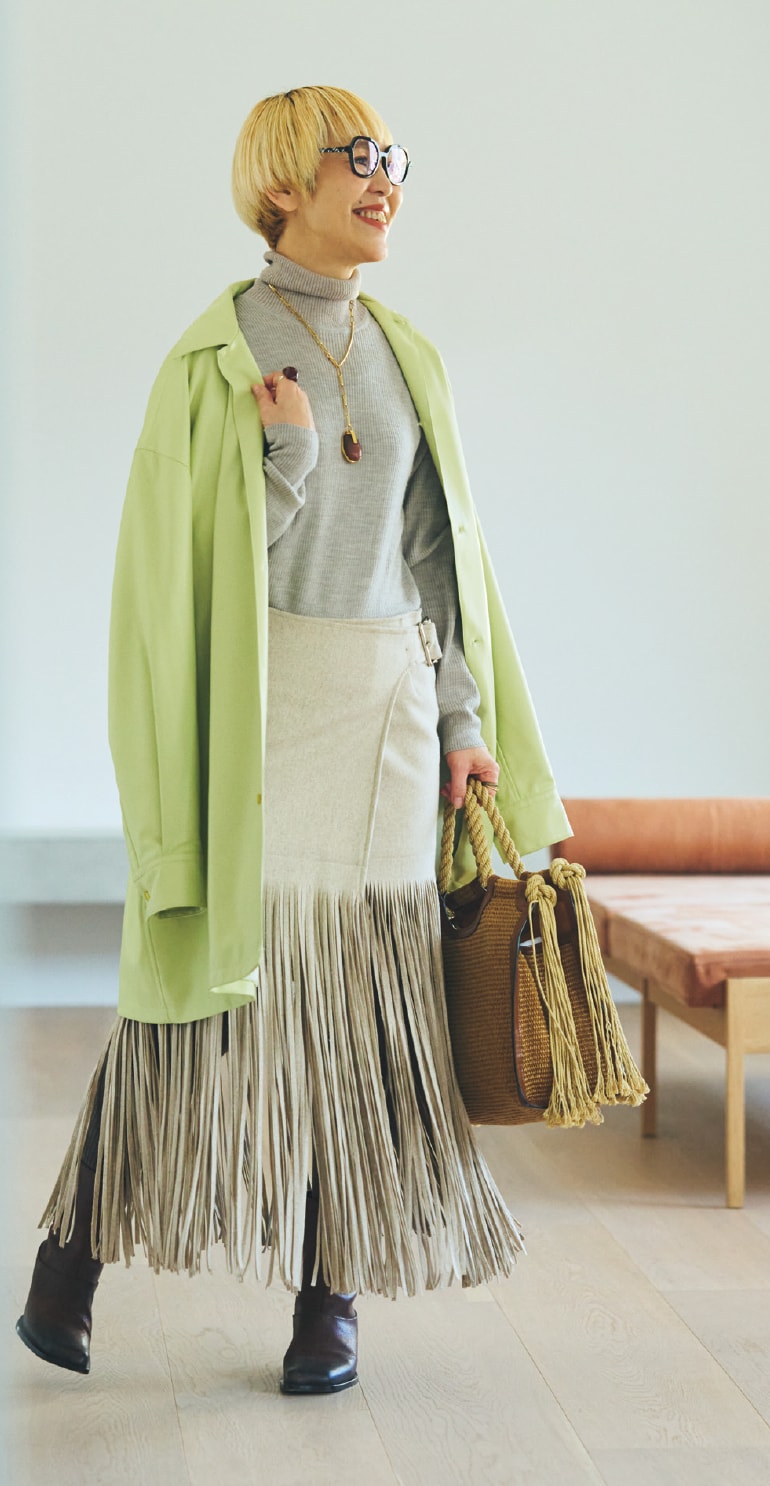 ピスタチオカラーのコートやグレーの上下など淡い色調の服に、小物は茶色や黒の締め色を。