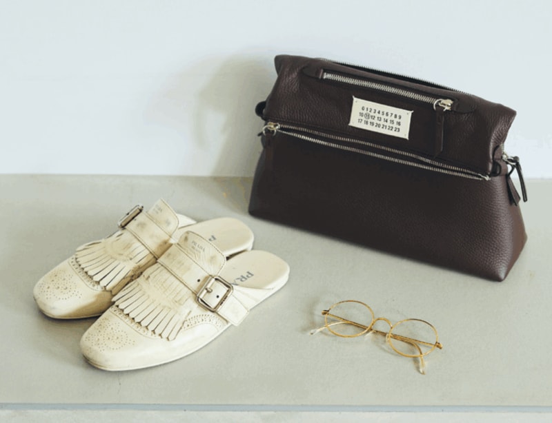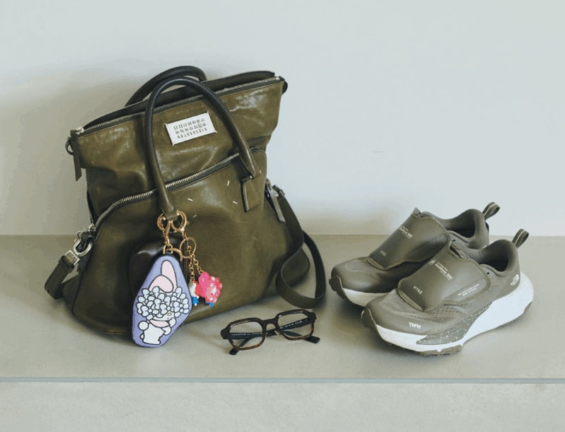 「ショルダーを付けると斜めがけもできるので便利」。スリッポンはキルトローファー風でパンツに合わせやすいアイテム。