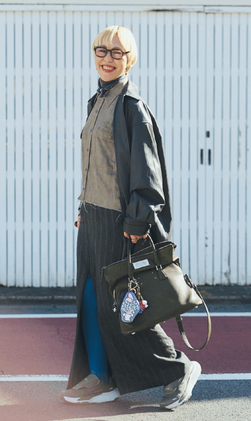 小物の色揃えは基本ですが、スニーカーやバッグ、めがねをカーキやブラウンなどトーンを統一することでこなれ感がアップ。