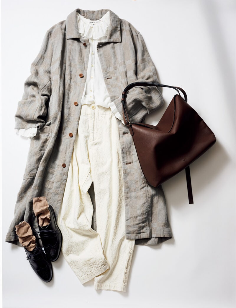 シューズ¥39,600 /ジャランスリウァヤ(ジャランスリウァヤ 日本橋)、パンツ¥29,700 /パドカレ(パドカレ六本木)、ロングコート¥99,000 /ヴラスブラム(ヴラスブラム目黒店)、シャツ¥28,600 /ビリティス・ディセッタン(ビリティス)、バッグ¥25,300 /アンドミューク(アマン)、ソックス¥3,080 /ケイ ハヤマ プリュス