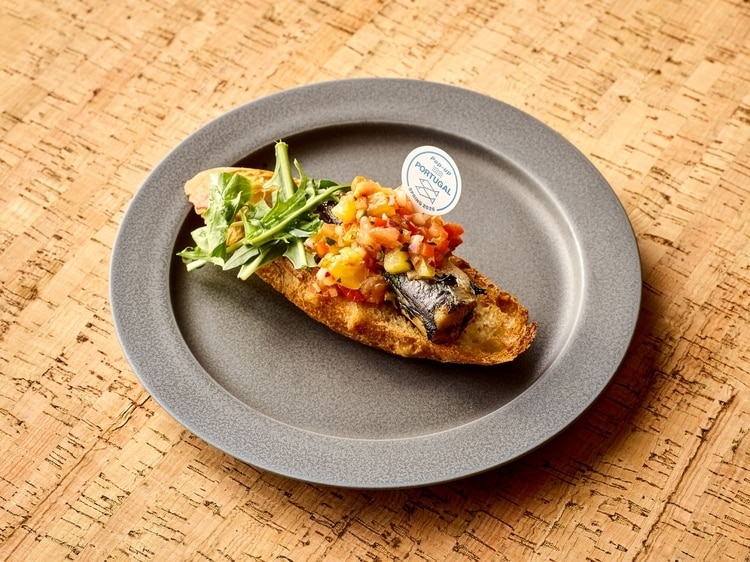 ポルトガルより届いた風味豊かなイワシのマリネにハーブを添えてグリルし、トーストしたパンにのせたシンプルなタパスです。爽やかなお野菜のソースが添えられています。