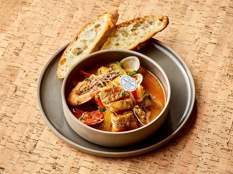 魚介と野菜をじっくり煮込んだポルトガル風ブイヤベースを、ミニサイズで楽しめます。コク豊かな味わいのスープにはコリアンダーやパセリ、ハーブなどの香りも合わさり、後味は意外にもすっきりめ。バゲットを併せて楽しみます。
