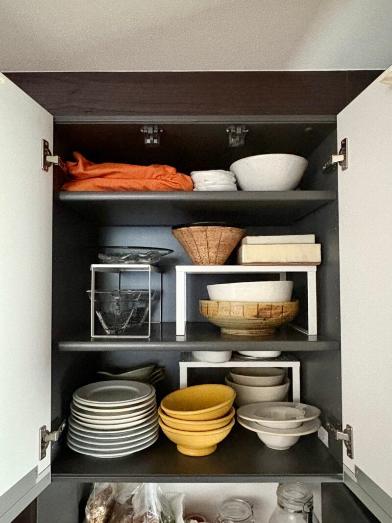 <今の住まいの食器棚の様子> 以前の暮らしよりも色味が少なくなった気がします。以前は子どもの食器が多かったから。