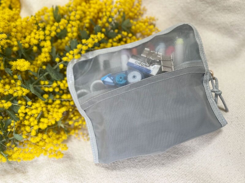 がばっと開いて自立するのに、ファスナーを閉じるとすっきりしたシルエットになるのがお気に入り。バッグの中でもデスクでもすっきり収まってくれるのがいいところです。メッシュ素材で軽いのも魅力。
