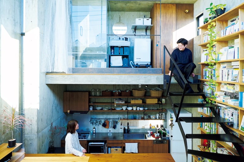玄関扉から1段下がったスペースに造作のテーブルとパソコン。五十嵐理人さんの設計事務所だ。エントランスとの間に高さ40㎝ほどの柱状の壁が地面に渡され、テーブルで打ち合わせを行う際のベンチを兼ねている。「それ、床の躯体です」と理人さんがいたずらっぽく笑った。なるほど、普通はフロアを浮かすことで隠されてしまうコンクリート躯体がむき出しになり、腰掛け兼間仕切りとして活用されているのだ。その分天井が高くなる。視線を上げるとキッチン、しかも下半分だけが見える。リズミカルで、明快で、なんだかわくわくさせる家である。 自分らしい部屋を整えるのに、その“狭さ”はうってつけの条件なのかもしれません。 狭くて、居 …
