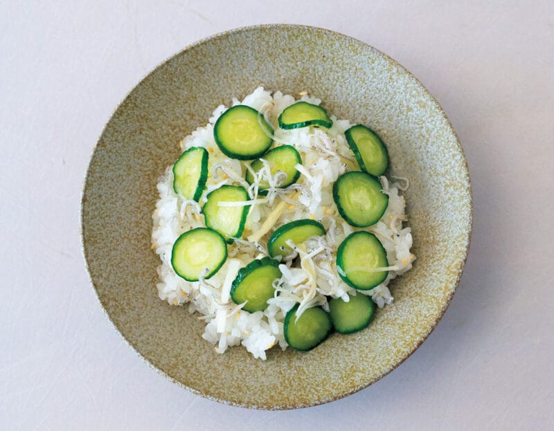 ごはん1 合分に酢じゃこを大さじ3(漬け汁も含めて)、きゅうり、白
