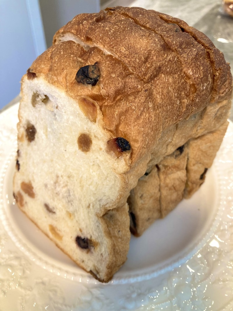 3種類のレーズンが散りばめられた食パンで見た目も華やかです。生地も4種類の北海道産小麦がミックスされていて、モチモチ系の食感でした。