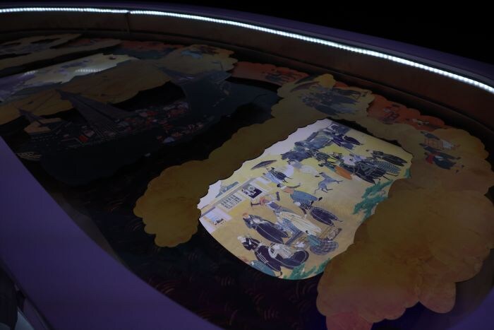 館内で最初に迎えてくれるのは、動く南蛮屏風(びょうぶ)。両国のつながりの変遷を映像美が伝える。