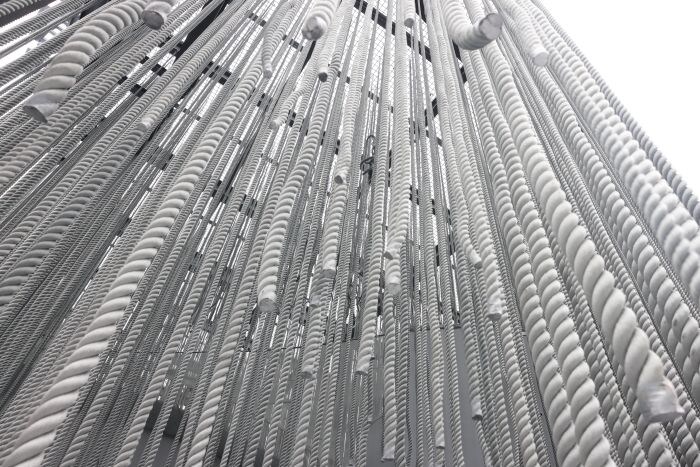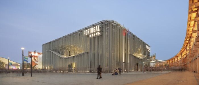 まず、ポルトガル館はその外観に足を止める人が多い。何やら揺れるシルバーのラインが目をひくからだ。近づいていくと、ラインはつり下げられたロープであることがわかる。その数、およそ1万本だ。