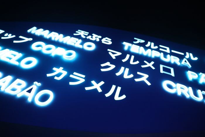 次に表れるのが、ポルトガル語から発生した外来語の文字が流れる映像。普段何げなく使用している言葉の中に、ポルトガル語をルーツにするものがなんと多いことか。よく知られているのは、「カステラ」「天ぷら」「パン」。他にも、「ボタン」「アルコール」「かるた」など、実に250種類ほどにおよぶ。先にあげた「屏風」もポルトガル語からきているそうだ。