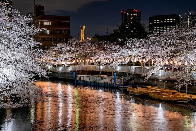 お花見を楽しめるのは日中だけではありません。情緒あふれる夜桜を満喫する宵のクルーズも一興です。江東区・門前仲町では「令和8年お江戸深川さくらまつり」を開催中。門前仲町駅すぐの黒船橋乗船場から発着する大横川周遊の夜桜クルーズは、門前仲町沿いに流れる大横川の桜風景を堪能できます。水面まで低くせり出し幻想的に浮かび上がる桜と、桜並木に連なる提灯が下町情緒満載で、写真映えすること間違いなし。平日の仕事終わりにお花見を楽しみたい、という方にもおすすめです。