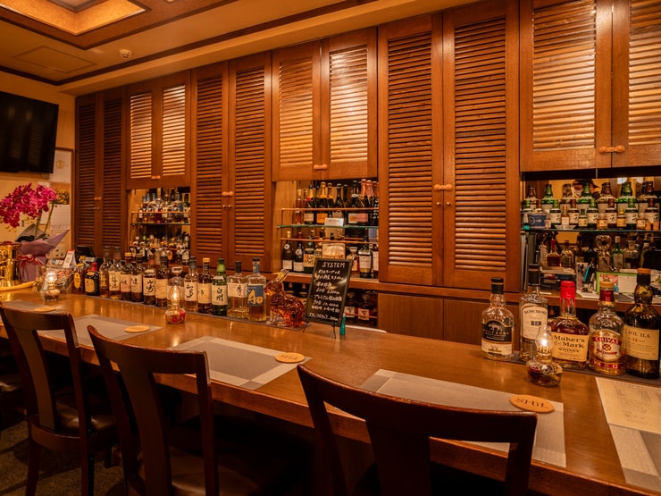 街のざわめきから離れた知る人ぞ知る場所ながら、初めて訪れてもリラックスできるアットホームな雰囲気。ジャズの心地よい音楽が流れ、しっとりと落ち着いた店内には、カウンター6席とコの字型のボックス席が設えられています。ボトルがずらりと並ぶカウンターに座り、ウィスキーグラスを傾けながら、二人で静かに会話を楽しむのも素敵です。