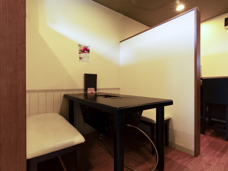 内装はシンプルにまとめられ、アットホームな雰囲気。煙が出にくいロースターを使用しているので白い壁紙を使うことができ、店内は明るい印象です。ベンチシートのボックス席はプライベート感もあり、デートにもオススメ。カウンターでは横並びに食事ができ、二人のペースでゆったり焼肉が楽しめます。