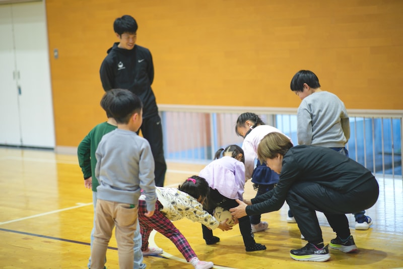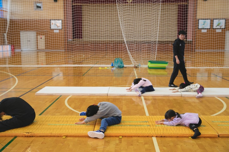 2025年4月から始まった幼児スポーツ教室は、毎週水曜16:00〜17:00に開講。2026年2月現在、約10人が通っており、取材したこの日は6人が参加しました。指導者は半澤さんを含め3人と手厚く、元気なあいさつから準備運動、マット運動や逆立ち、なわとびまで、子どもたちの歓声が響く、あっという間の1時間でした。