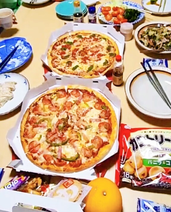 各部屋から料理や食器などを持ち寄り、テーブルにはデリバリーのピザが並びます。