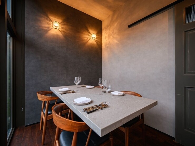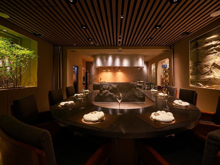 一見すると、レストランとは思えない外観。重厚な扉の向こうに広がるのは、まさに美術館のようなオシャレな雰囲気です。料理を置くテーブルにはスポットライトが当たり、職人が手彫りした壁の彫刻も見応え十分です。店内は8席のみの落ち着いた空間で、貸切利用にも対応。お互いの声が届きやすく、親睦を深めるのにも最適な一軒です。
