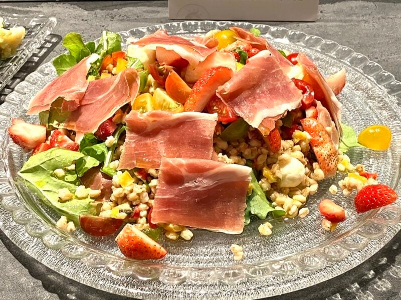 フレンチをベースにしたお料理の中で同じく人気が高かったのは「小エビのヴォル・オ・ヴァン オマールエビのビスクソース」。パリパリのパイ生地に包まれたお頭付きでプリプリのエビはジューシーで、濃厚なオマールエビのソースとの相性も抜群。いちごを使ったサラダを付け合わせに交互に食べると、芳醇なソースの香りと相まって、飽きることなくいくらでも食べ進められてしまいます!