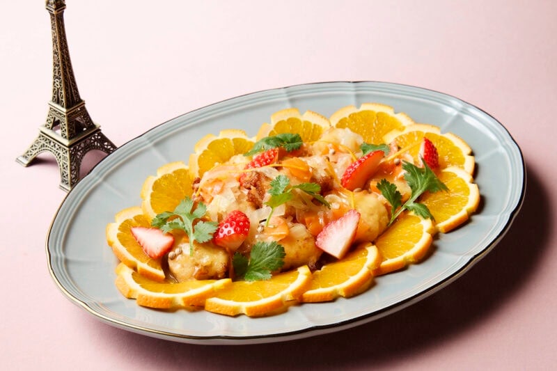 ホテルの料理長たちがアイデアを出し合い、用意したメニューの数々。今が旬のいちごを使ったメニューで特におすすめしたいのが、南仏プロヴァンス地方の伝統的な地中海料理にアレンジを加えた「白身魚のオレンジエスカベッシュ いちご添え」。通常であればレモンやお酢を使用するレシピが多いそうですが、今回はオレンジ果汁を使用。まろやかな酸味にオレンジの爽やかな風味といちごの甘酸っぱさがアクセントになっています。