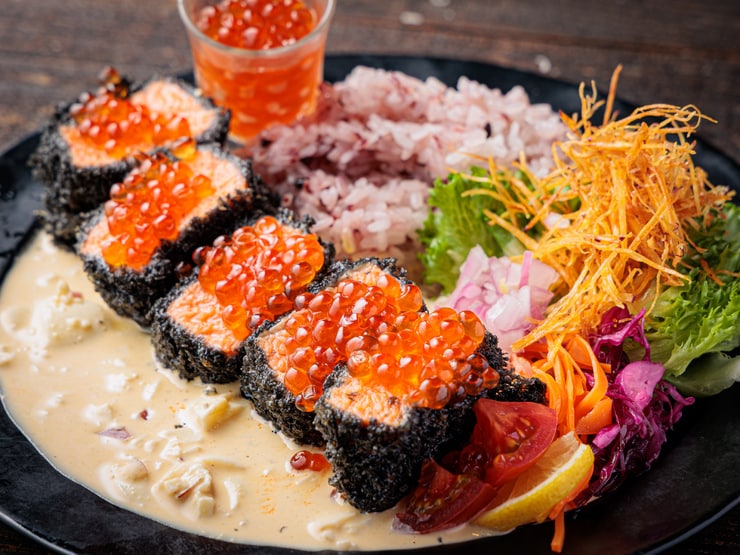 地元の新鮮食材を使った料理は、どれもボリューム満点です。分厚いサーモンとイクラ、濃厚なタルタルソースのハーモニーが楽しめる『タルタルサーモンオーシャンプレート』は、栄養バランスが抜群で女性に好評。具材たっぷりの『雲丹イクラポキ』もオススメの一皿です。ランチタイム限定でパンの食べ放題も追加できます。