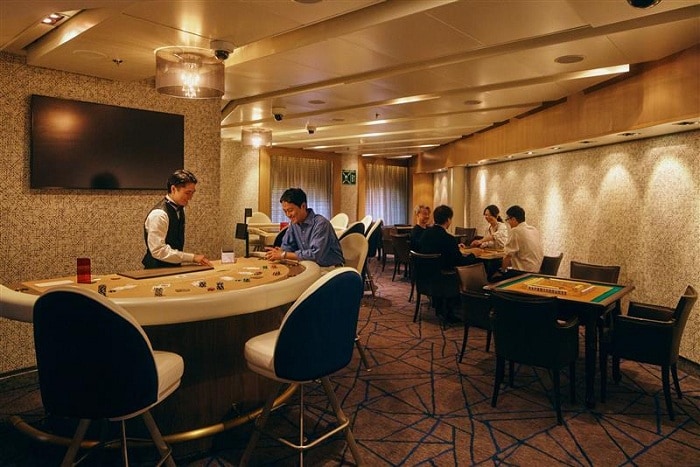 夜になると、クルーズスタッフがディーラーを務めるカジノルームでゲームを楽しめる。お金は掛けず、専用のチップを使ってテーブルゲームに参加できる。初めての人でもスタッフが声をかけてくれるのでとても入りやすい。ディーラーとの駆け引きを楽しみながら、同じテーブルの参加者同士で自然と会話も弾む。