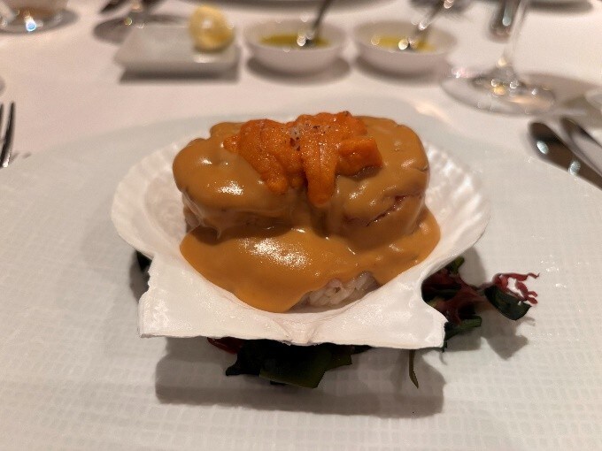 別の日のディナーは、「北斎 FINE DINING」へ。葛飾北斎の名が冠されたスペシャルダイニングは、フランス料理の三國清三シェフが監修。プリフィックスのコースメニューが提供される。好みに応じて品数や内容を選べるスタイルだ。こちらはクルーズの料金には含まれておらず、追加代金がかかり、事前予約が必要。ベジタリアン向けの料理も用意されている。
