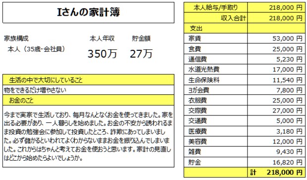 FPオフィス「フォルテシモ」へ依頼されたお客さまの家計簿を、mymoで診断する【うちの家計簿】。今回は35歳女性Iさん、一人暮らしの家計簿です。