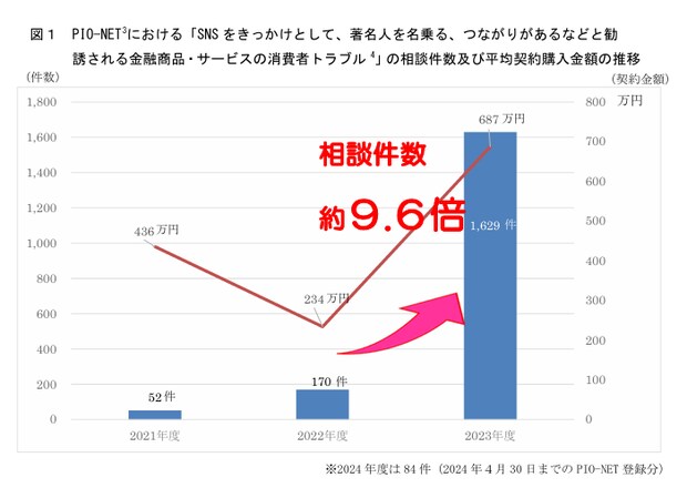 近年、SNSをきっかけに投資を勧められ、お金を振り込んだら相手と連絡が取れなくなるなどの投資トラブルが増えています。国民生活センターの調査によると、2023年度の相談件数は2022年度と比べて約9.6倍に増加しました。