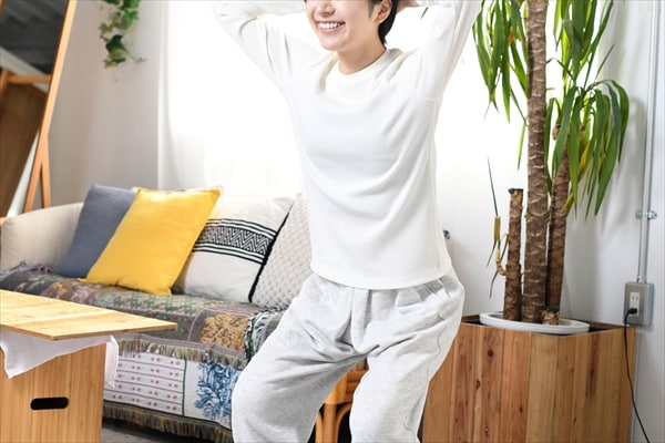 まず筋トレでは、全身の中でも特に筋肉量が落ちやすい下半身を意識するのがおすすめ。スクワットやかかとの上げ下げ、椅子からの立ち座りなど、特別な器具を使わずできる動きでも十分です。